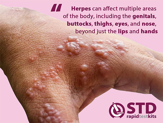 The manifestations of herpes are not confined to the lips and hands. Herpes of the genitals, usually due to HSV-2, involves painful sores or blisters that appear around the genitals, rectum, buttocks, and thighs. Oral herpes, generally due to HSV-1, normally occurs on the lips but may also occur inside the mouth, near the nose, or inside the nostrils.