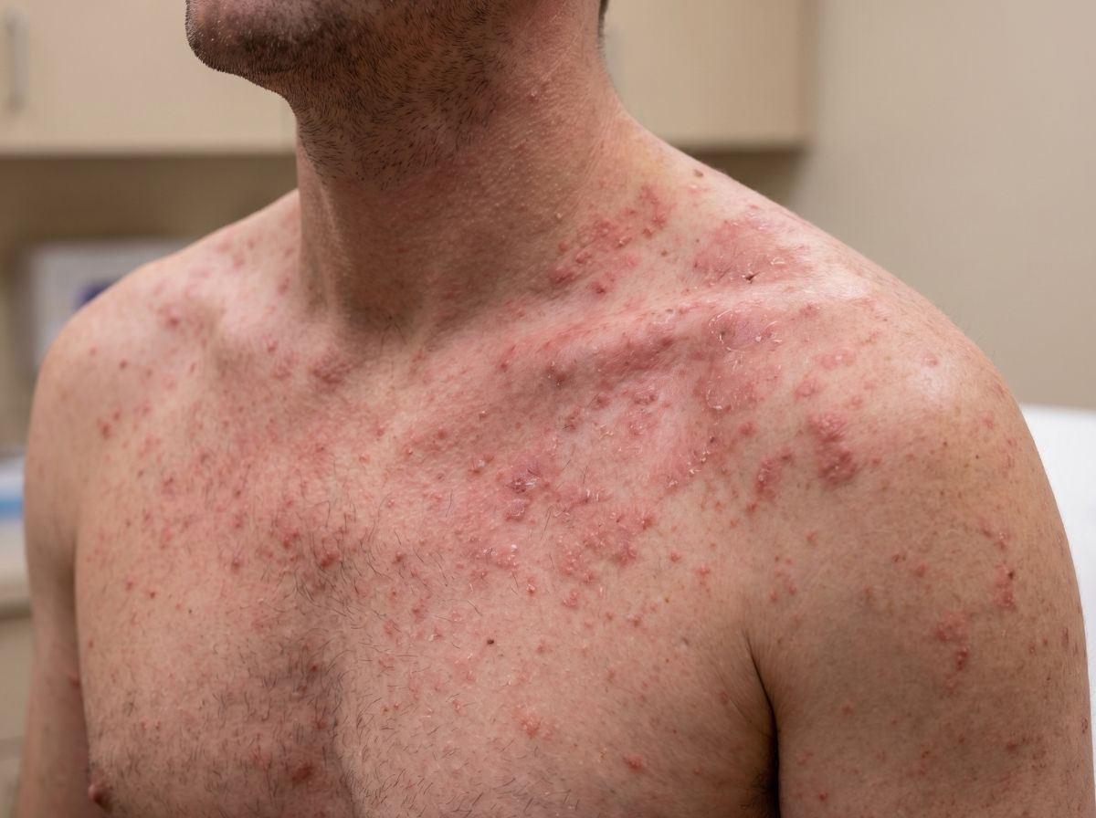 | Primary location | Chest, back, upper arms; sometimes neck and face |