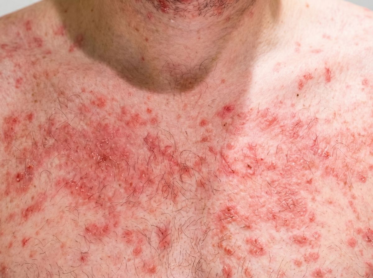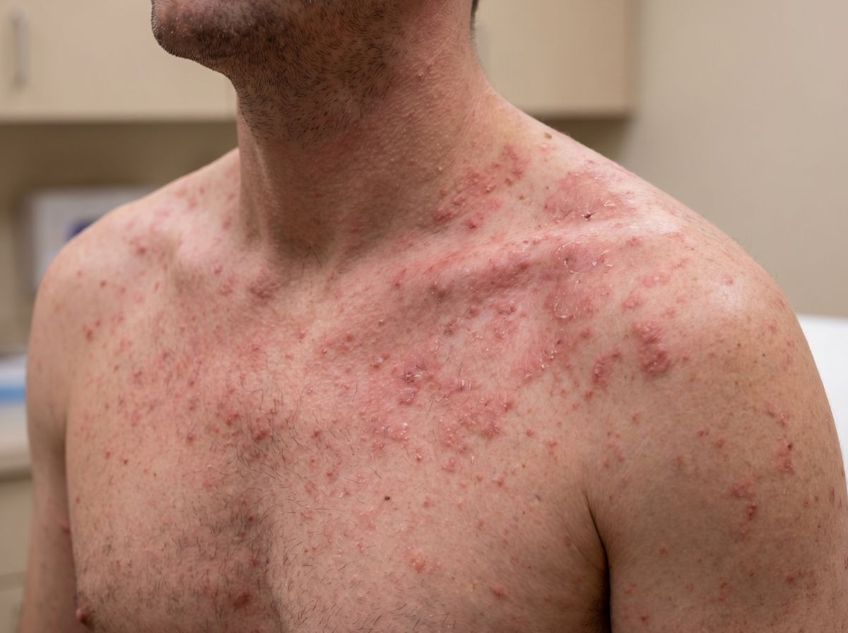 Eczema and atopic dermatitis vs. HIV rash: Eczema tends to be chronic, recurring, and concentrated in predictable locations for that person, inner elbows, behind the knees, hands, and sometimes the face. It's tied to known triggers: cold weather, certain soaps, synthetic fabrics, and stress. A first-time eczema flare is possible, but even then it doesn't come with fever, swollen lymph nodes, and sore throat. If you're seeing a dry, scaly, intensely itchy rash in typical eczema zones, the seroconversion picture doesn't fit.